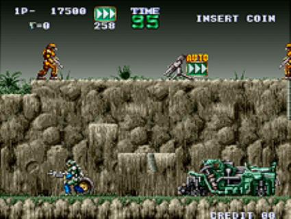 A two-player co-op horizontal scroller. Players shoot other soldiers, climb into jeeps and helicopters, pick up different weapons and destroy the end-level building.