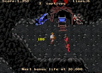 You control Indiana Jones and start out by rescuing the children locked behind cages. Use your whip to kill pesky bats, birds, and to stun the thuggie guards. Next you make your way down the mine cart. Dodge the thuggie chief, dead ends, and other thuggie guards in a rival cart. Knock over barrels, piles of rice, and other things to make sure noone's following you. Once you reach the end, you enter the sacred chamber where the Shankara stone is kept. Collect it and the process starts all over again. Once you collect your third Shankara stone, you must then cross the rope bridge to finish your game.