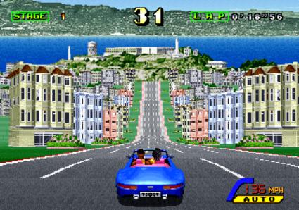 Another sequel to the Out-Run franchise. This time around, you have several vehicles to choose from, each with their own strengths. Some hug corners great, but only have two gears. Some are speed demons with six gears. Most models permit two players head to head, but it is possible to link 4 deluxe cabinets together for 8 player racing.