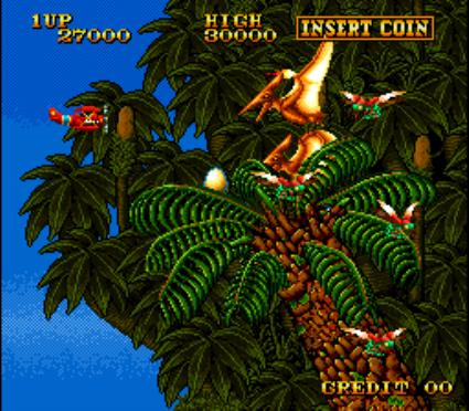 The player takes control of a biplane battling dinosaurs, pterosaurs,
