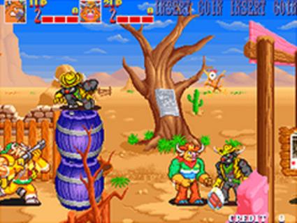 Cartoonish shooter with characters that resemble Warner Brothers cows. Gameplay and graphics are similar to Sunset Riders.
