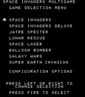 Space Invaders, Space Invaders Deluxe, Jatre Spectre, Lunar Rescue, Balloon Drop, Space Laser, Galaxy Wars, and Super Earth Invasion.