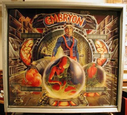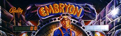 The fifth and last widebody pinball from Bally - not counting the limited run of "SuperPin" games from the early 1990s. EMBRYON was also the first Bally game to feature artwork by Tony Ramunni, and the first (and last) game from this company to use the trademarked "Flipsave" ball saving feature - a small flipper inside the right outlane used by players to flip lost balls back into the return lane. (according to Pinball Snapshots)