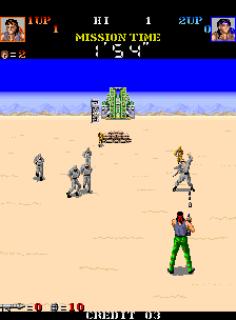 A scrolling shooter in which the heroes are moving forward with the view similar to that of a driving game in which the screen scrolls forward when you drive. Pick up grenades and guided missiles to augment your firepower against the waves of enemies ranging from foot soldiers to tanks and planes.