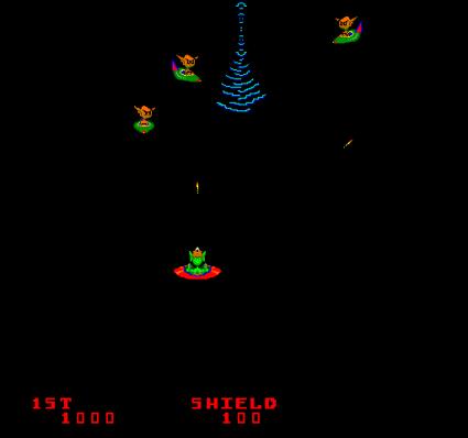 A large deluxe cabinet shooter where you guide your spaceship to dock with the mothership while avoiding or shooting enemy fighters. Game also features a bonus round every 5th stage which involves running through a junkyard retrieving spaceship parts.
