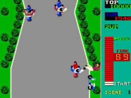 The initial stages of the game are played with a view from above your motorbike, looking down onto the road. Other motorbikes line up with you for a "traffic light" start. Once under way, they jostle you with their legs, and you can jostle back by pressing the button and left or right. With no bikes by your side, you can gain a bit more speed. There are occasional constrictions on left and right, and central islands. There are no sharp corners! Occasionally a car appears in front of you leaving bombs in its wake. You crash if you hit a bomb, hit the car, or hit any area off the road. If you crash, you lose time. The game is played against the clock, with bonus points decreasing as you play. Towards the goal, the view switches to above and behind your motor-bike, looking further ahead than before towards a city in the distance. There are traffic cones to avoid if you can. After every three levels there is an intermission screen where a bonus is awarded for each vehicle you passed.