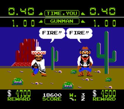 You are in the old west against the best of the wild gunmen. Each player must shoot the gunman before he shoots you. Firing early (before their eyes blink) will get you disqualified. You can choose to take on on or two at a time. There is also a third game where you take on the gunman downtown.