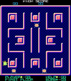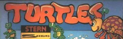 Turtles is a maze game where the player is a turtle trying to bring baby turtles (called "kidturtles") to their homes while avoiding beetles. Scattered throughout the maze are boxes with question marks on them. When the player walks over a question mark, a baby turtle will crawl onto the main turtle's back, a house will appear at a random location on the map, and the player will have to bring the baby turtle to its house while avoiding beetles. Other times, however, beetles will come out of the boxes, which the player will have to quickly run away from. The player's only offensive move is the ability to drop "smart bombs" to temporarily stun the beetles. The player's smart bombs can be refilled by grabbing the smart bombs in the middle of the maze. However, unlike actual smart bombs, the player's bombs do not move and stay in a single place until a beetle runs over it.