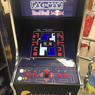Housed in a special arcade cabinet with a refrigerator component selling what else...Red Bull energy drinks.