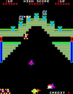 Occasionally, there is a bonus round where your character flys back and forth at the top of the screen in a hot-air balloon in an attempt to drop rocks down upon a monster that is running at the bottom of the screen. There is a fuel gauge that determines when the bonus round will end.