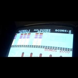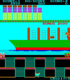 Catch the luggage that falls from the top conveyor belt and throw it up into one of four berths on the ship. You need to get four in each berth without getting hit by a rock thrown by the man on the ship, getting run over by the luggage cars or before running out of luggage on the conveyor belt. (It is an instant game over if you run out of luggage.) The second level, you throw a rock up at some crates of dynamite, knocking one down. You need to catch it before it hits bottom. When a crate reaches bottom it explodes, removing the lowest level of your playing area. If you are hit by a rock thrown by the man on the conveyor belt or if you are on the same level with the exploding crate, you lose a life. You get points for every crate you catch. Then you return to the ship only this time the speed has increased.