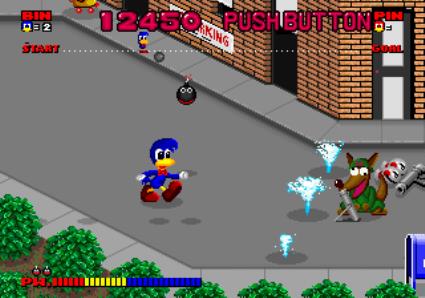 You control a duck fighting against enemies including rhinos that play football in this fighting game.